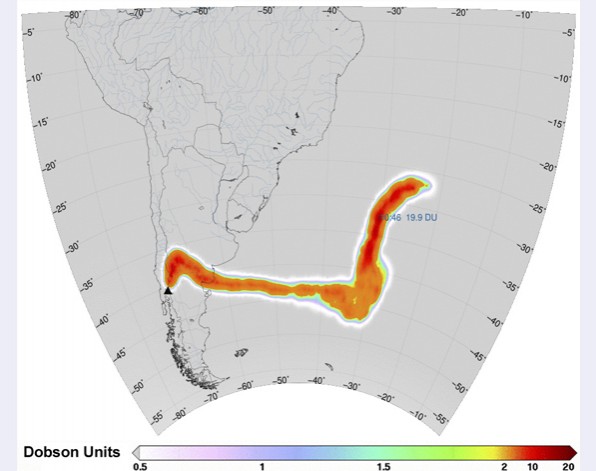 Esta imagen representa la enorme columna de dióxido de sulfuro arrojada por el complejo volcánico Puyehue-Cordón Caulle en junio de 2011. Los datos fueron recogidos por el IASI (Interferómetro atmosférico de sondeo infrarrojo) montado en el satélite Met-Op A del EUMETSAT.