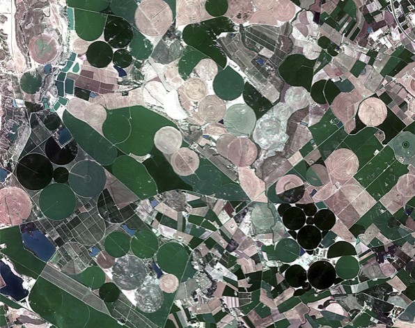 Los cultivos de trigo, cebada, fruta y verduras inundan el paisaje de Aragón y Cataluña. La forma circular de estos campos agrícolas se debe al sistema de riego empleado, consistente en un pozo perforado en el centro de cada círculo que abastece de agua al cultivo mediante aspersores rotatorios.